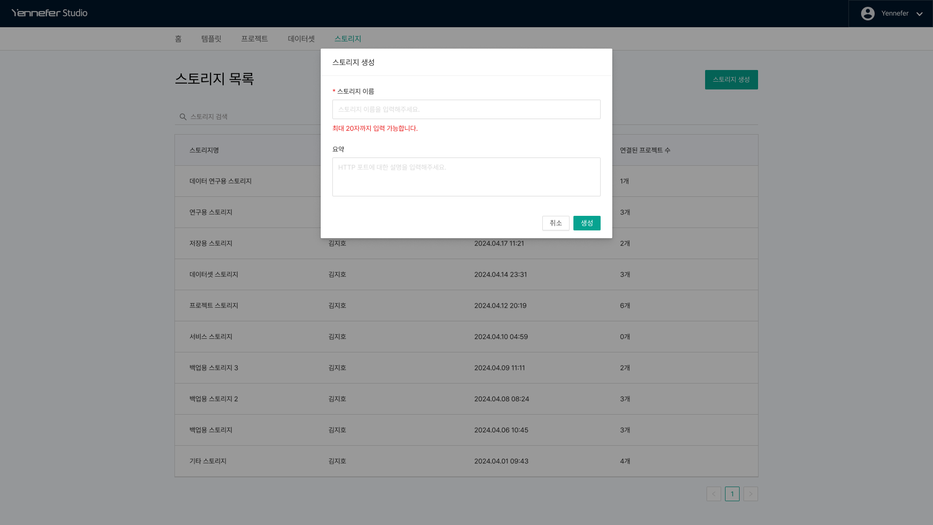 * 스토리지 생성 모달에서 스토리지 이름과 요약을 입력하시면 스토리지 생성이 완료됩니다.