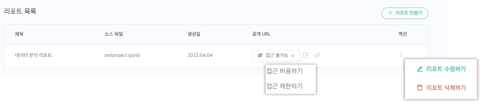 리포트 목록에서는 제목, 소스파일, 생성일, 공개URL, 액션을 확인할 수 있습니다.
