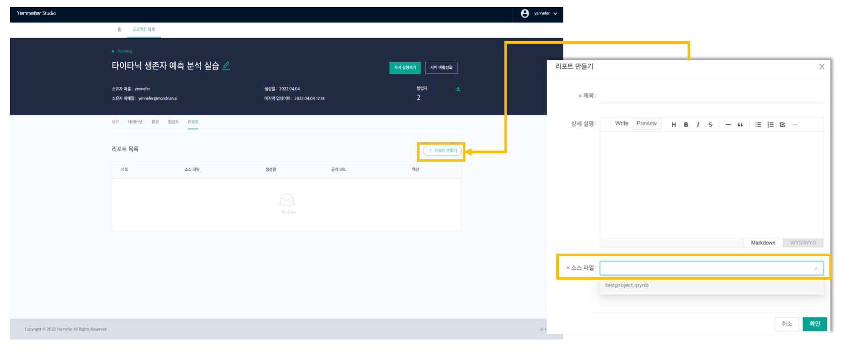 소스 파일의 화살표를 클릭하여 Jupyter Notebook에서 작업한 리포트 파일을 선택합니다. (소스 파일은 .ipynb파일로 reports폴더 안에 위치해야 리포트 생성이 가능합니다.)