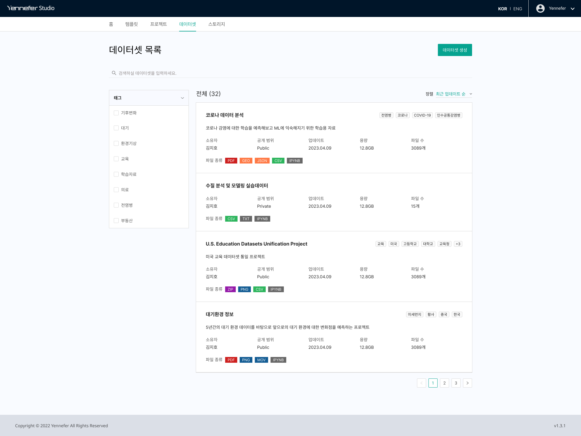 **Yennefer Dataset**은 엔터프라이즈 환경에서 데이터를 체계적으로 구성하고 관리하기 위한 데이터 공유 서비스입니다. 기업내 생산되는 데이터가 기업 가치화 되기 위한 가장 기본적인 도구로 사용자가 데이터 자산, 데이터 세트를 신속하게 발견, 선별, 분류 및 공유할 수 있도록 합니다.