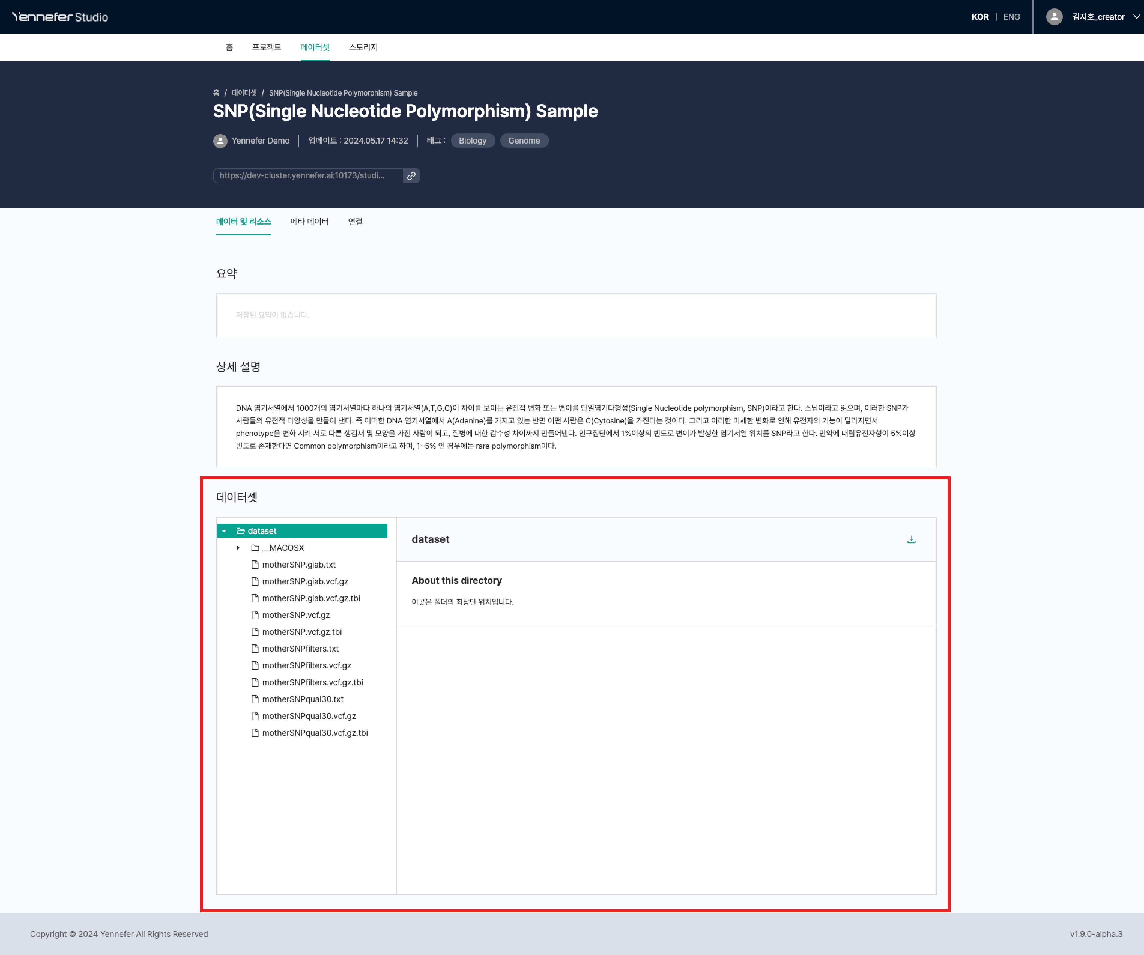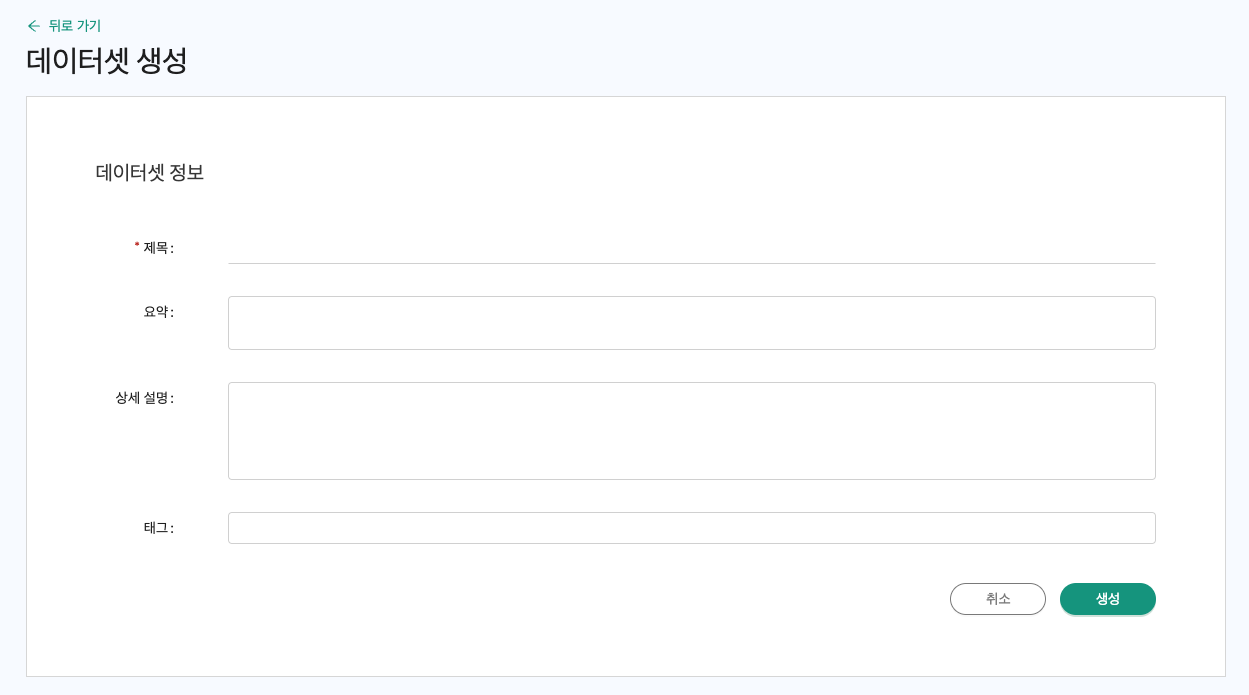 * 데이터셋 생성 페이지에서 데이터의 제목, 요약, 상세설명과 태그를 입력 후 **생성** 버튼을 클릭하면 생성이 완료됩니다.