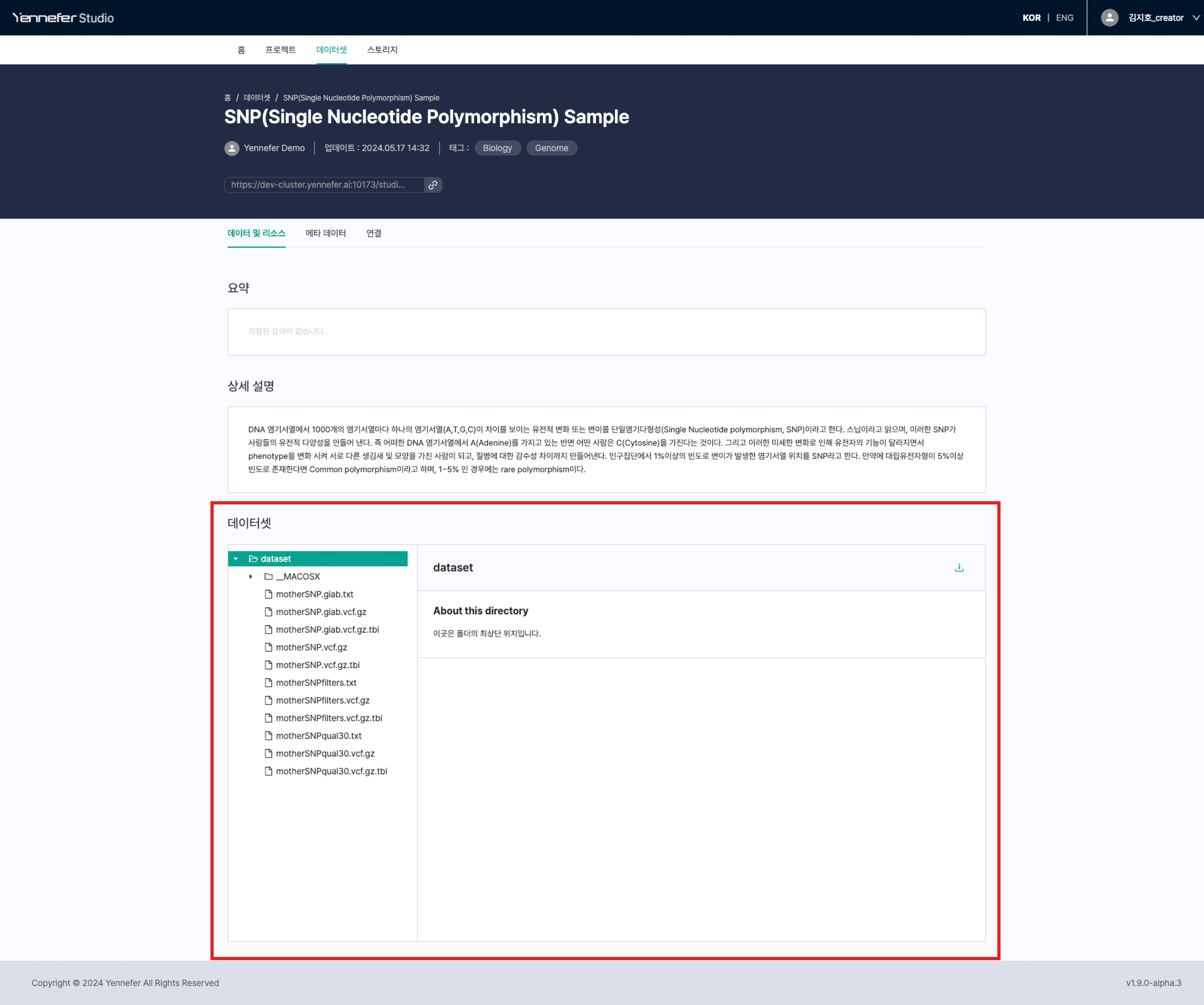 데이터셋 생성 페이지에서 데이터의 제목, 요약, 상세설명과 태그를 입력 후 생성 버튼을 클릭하면 생성이 완료됩니다.