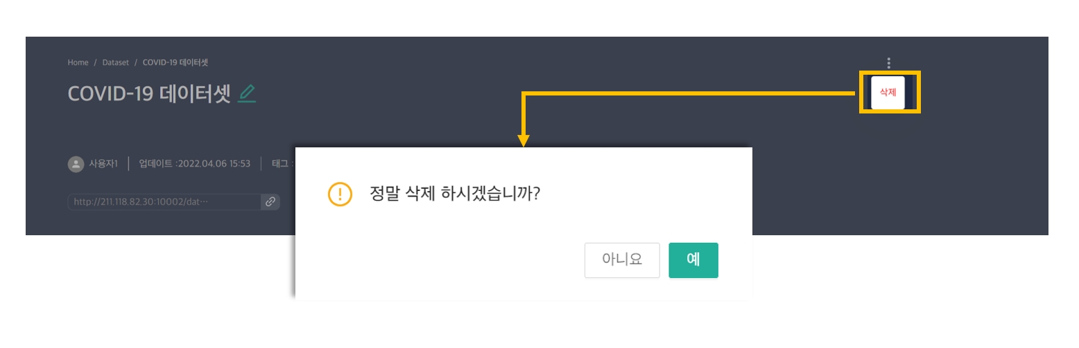 을 클릭하면 해당 데이터셋을 삭제할 수 있습니다. “삭제”를 누르면 알림 창이 뜨게되고, 확인을 누르면 정상적으로 삭제됩니다. 을 클릭하면 해당 데이터셋을 삭제할 수 있습니다. “삭제”를 누르면 알림 창이 뜨게되고, 확인을 누르면 정상적으로 삭제됩니다.