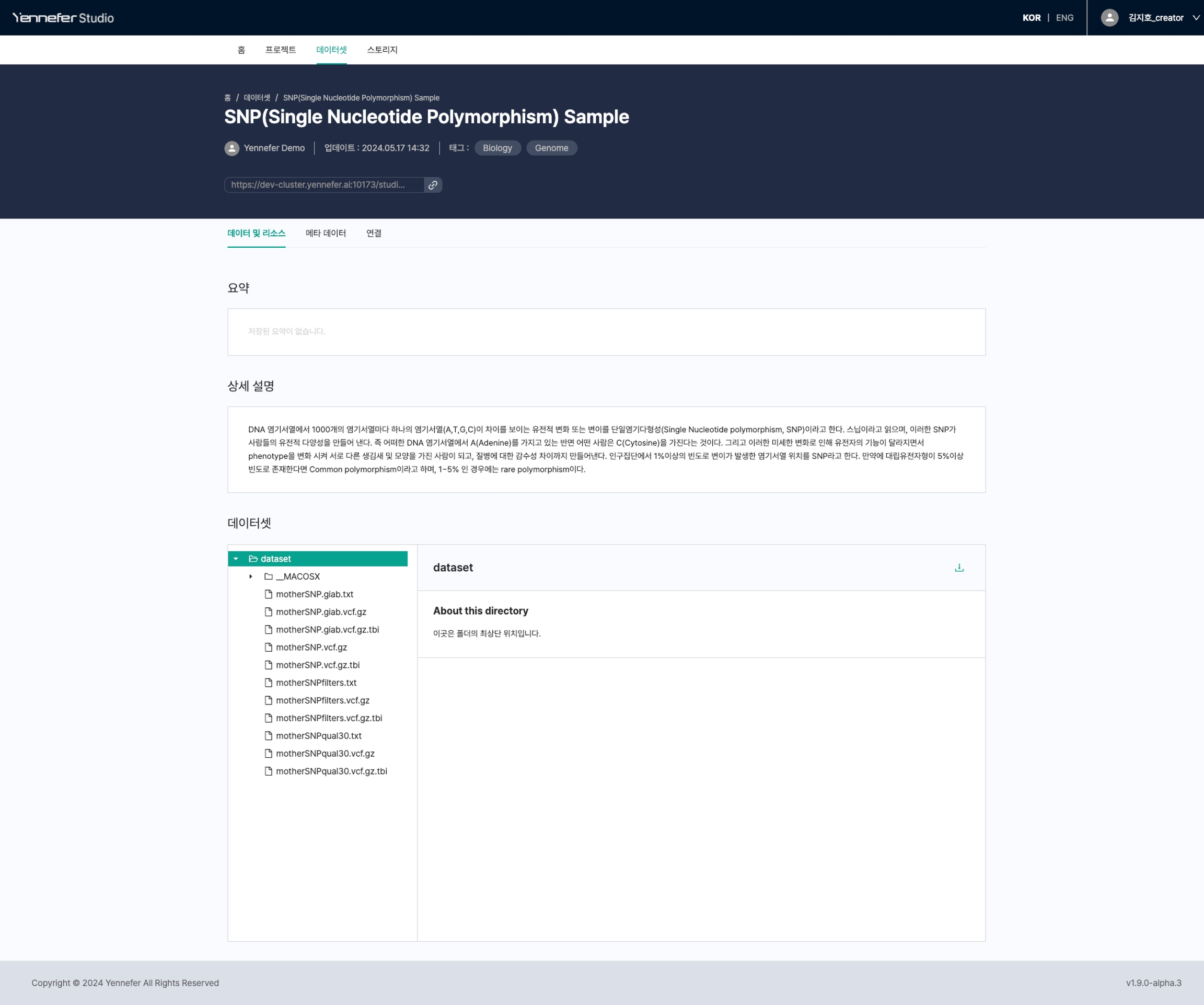 - 요약에서는 데이터셋에 대한 간략한 정보를 255자 이내로 입력할 수 있으며, 수정 버튼을 누르면 내용 수정이 가능합니다.