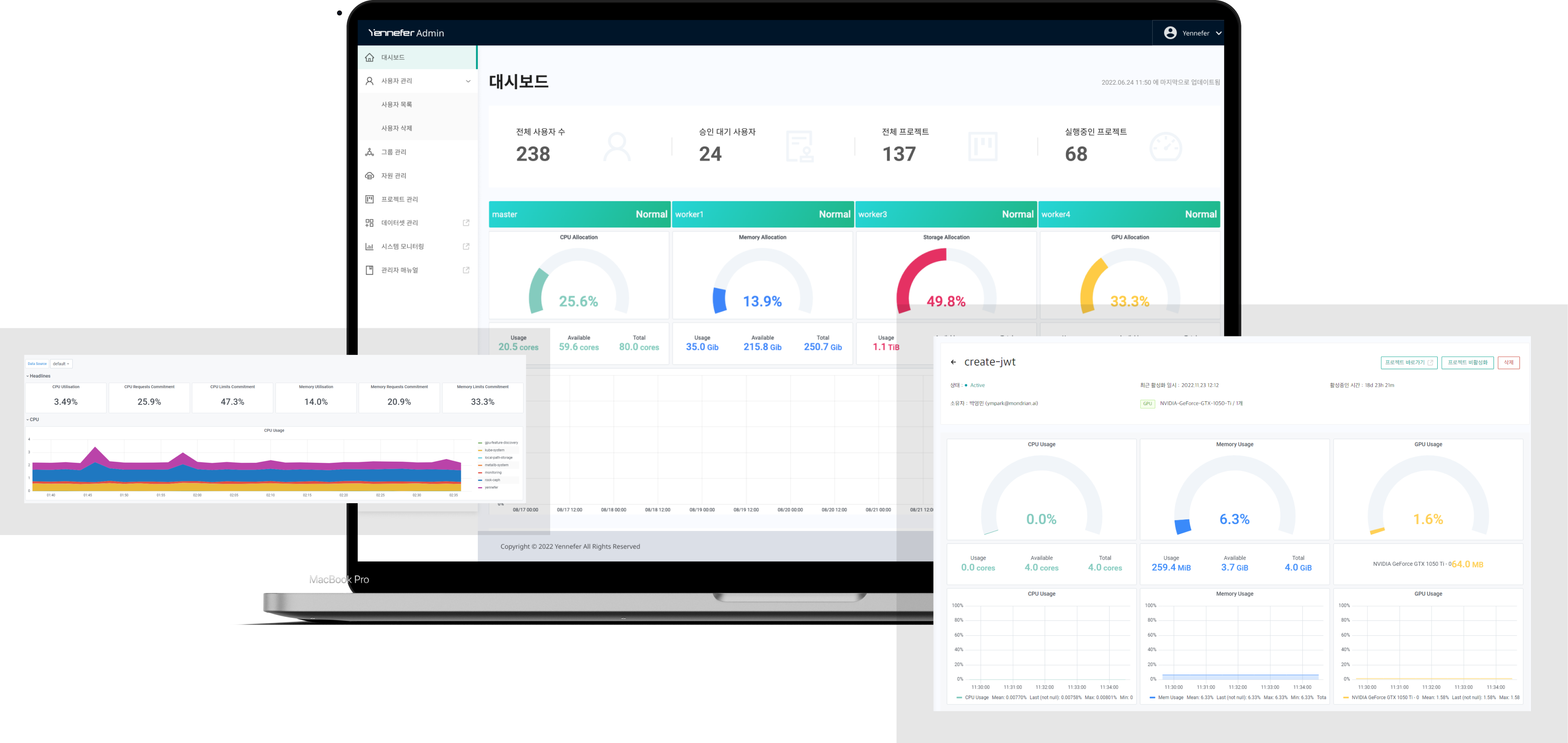 To leverage AI, Yennefer Admin uses Elastic AI Infrastructure technology to organize private clusters and provide flexible and optimized resource utilization based on usage. It also provides flexible and optimized resource utilization based on usage. It also provides GUI management tools that make it easy for administrators in your organization to manage users and resources integrally.