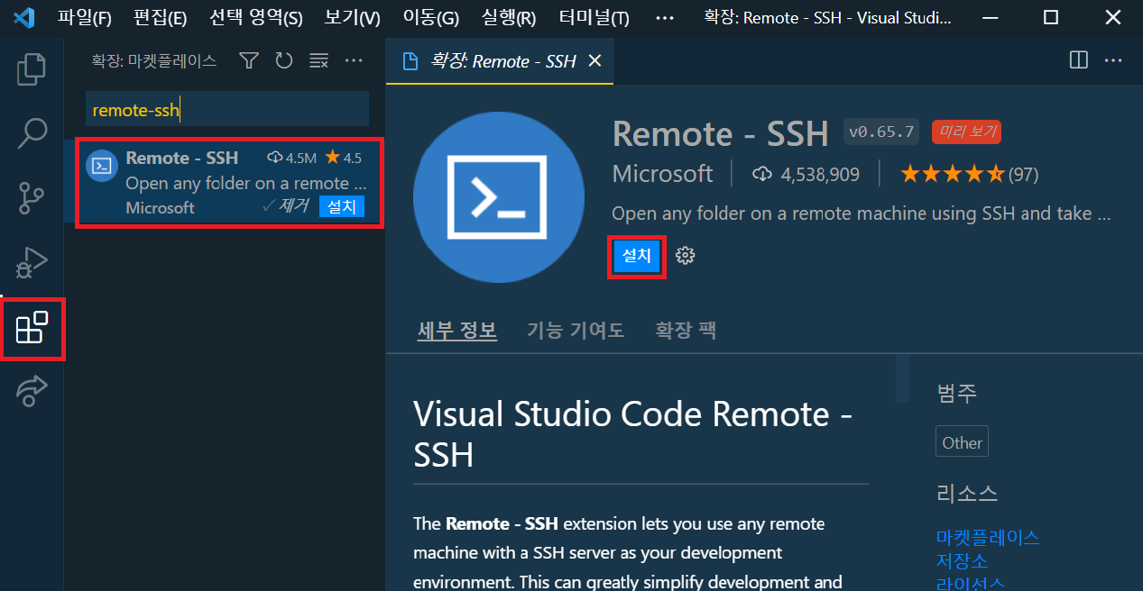 VSCode에 접속하여, 왼쪽 확장 탭에서 “Remote-SSH”를 검색 후 설치합니다.