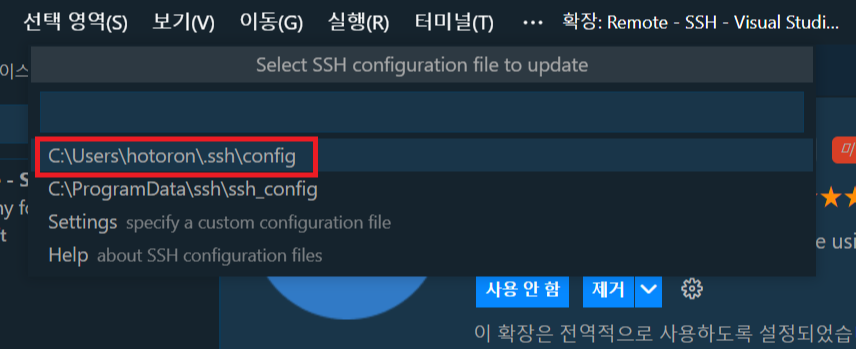 왼쪽 하단의 >< 표시를 누르거나 키보드의 F1 키를 누르고 SSH를 검색하여 설정 파일 열기 메뉴를 클릭합니다.