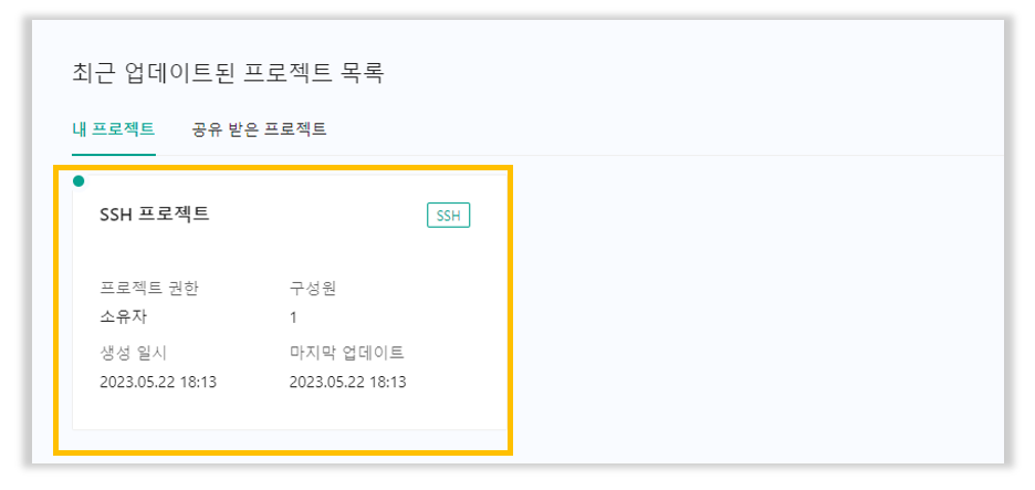 SSH 정보 확인을 위해 프로젝트 상세페이지 우측의 “프로젝트 활성화” 버튼을 클릭합니다.
