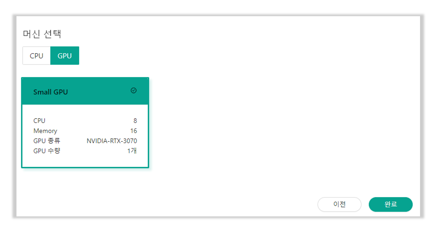 머신 선택 단계에서 프로젝트에 활용할 자원을 선택합니다.
