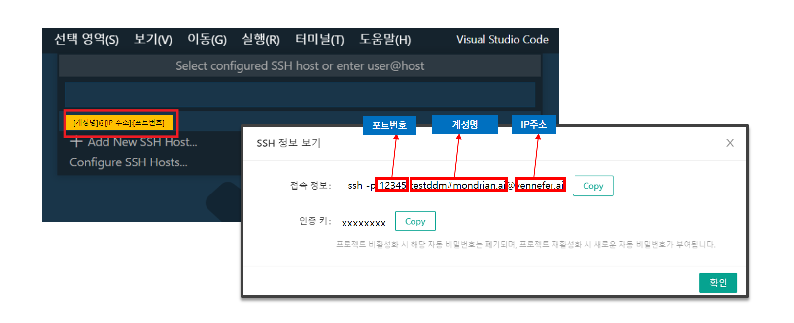 “SSH 정보 보기” 버튼을 클릭하면, 접속 정보 및 인증 키를 제공 받으실 수 있습니다. 이렇게 제공 받은 정보는 VScode에서 원격 접속 시 활용되니 참고하시기 바랍니다.