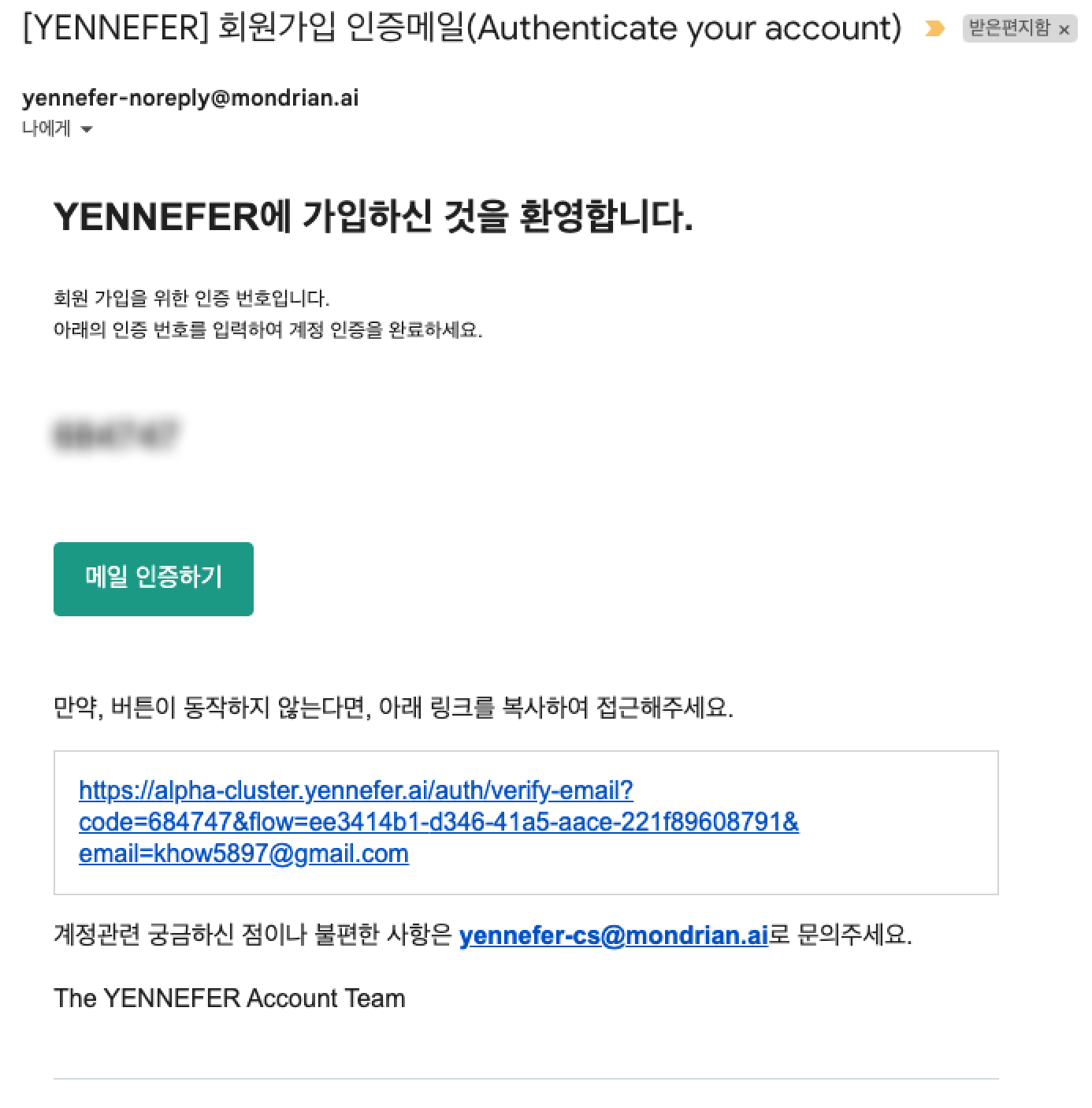 <figure><img src="https://content.gitbook.com/content/6rUKKBL0g8ZAX17UXuwG/blobs/QrKBTNBPYeRA22rEADJ4/image.png" alt=""><figcaption><p>발송된 인증 메일</p></figcaption></figure>