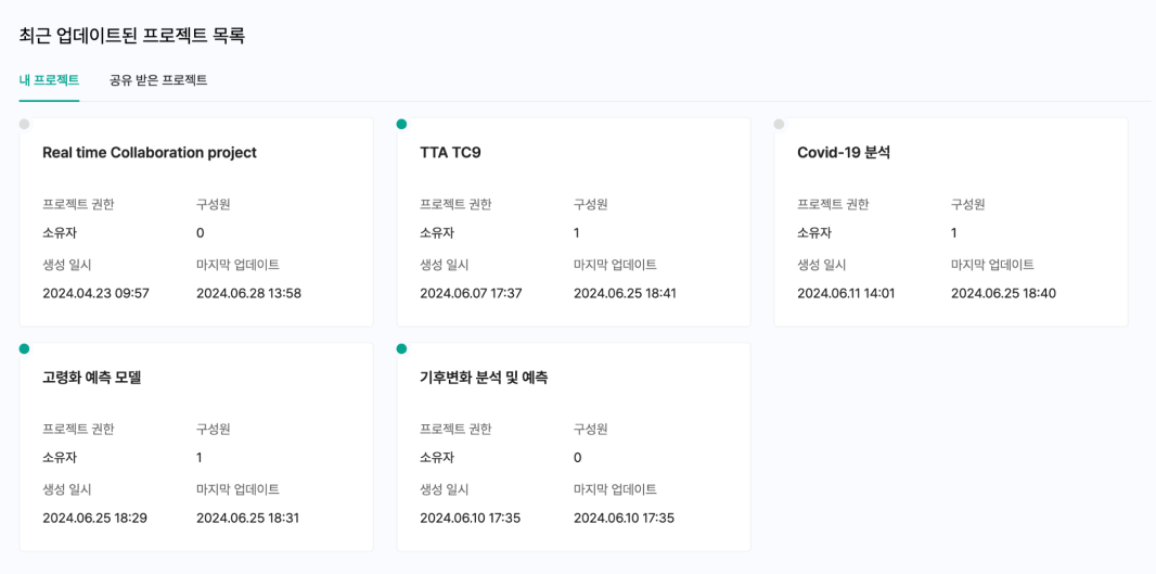 * **프로젝트 목록**: 내 프로젝트 및 공유 프로젝트 목록을 확인하실 수 있습니다.&#x20;