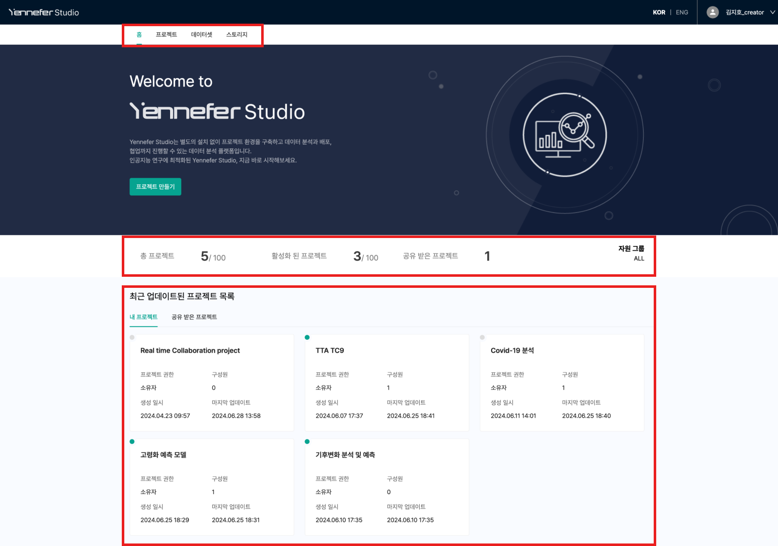 * **홈:** Home 화면에서는 사용 프로젝트 현황을 확인하고 새로운 프로젝트를 생성할 수 있습니다.&#x20;