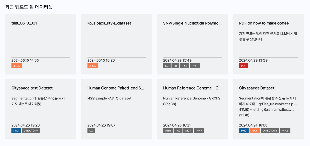 * 데이터셋 카드는 **데이터셋명, 업로드 날짜, 데이터셋 파일 타입**으로 구성되어 있습니다.