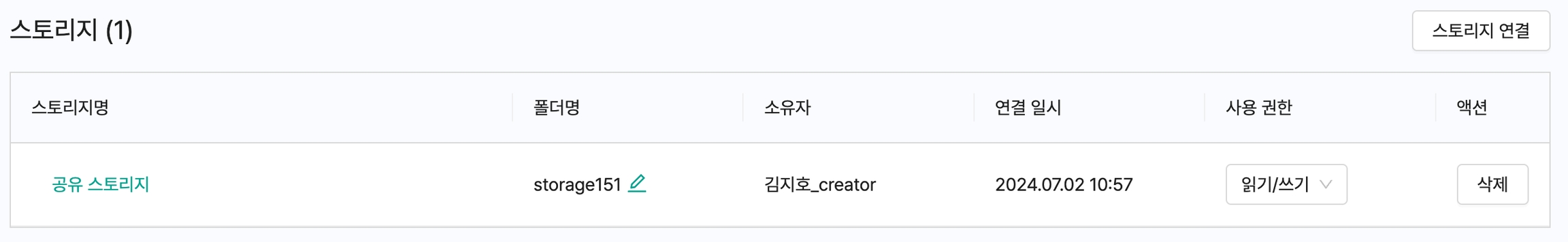 연결된 스토리지를 해제하고 싶으시면, 액션에서 "삭제" 버튼을 클릭하시면 됩니다.