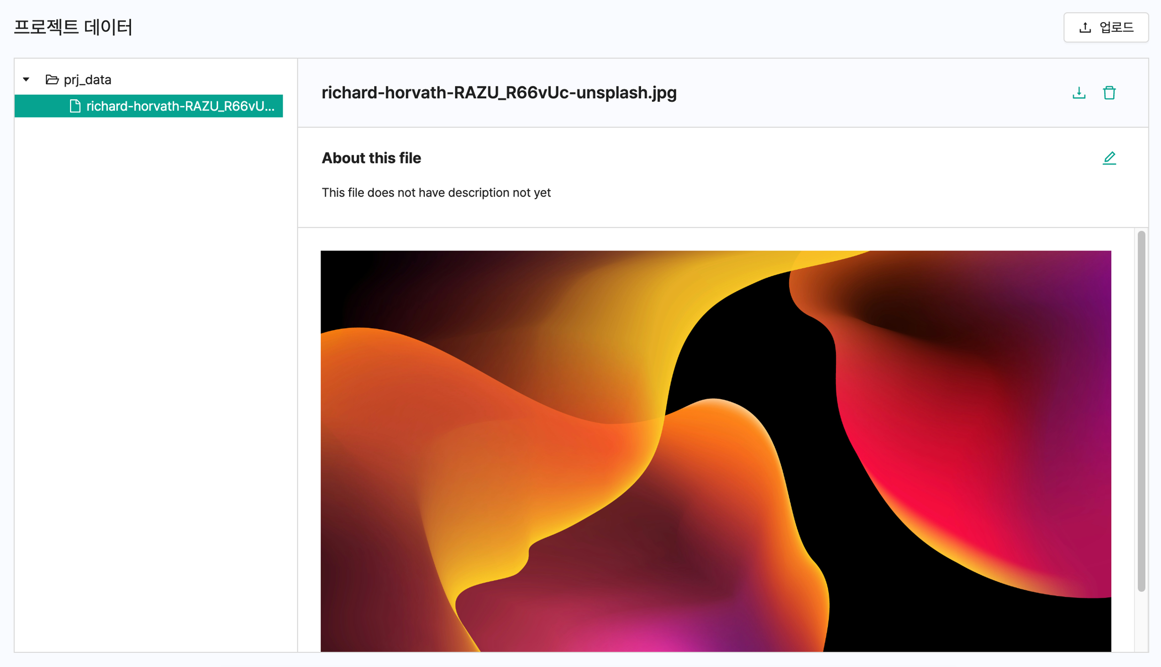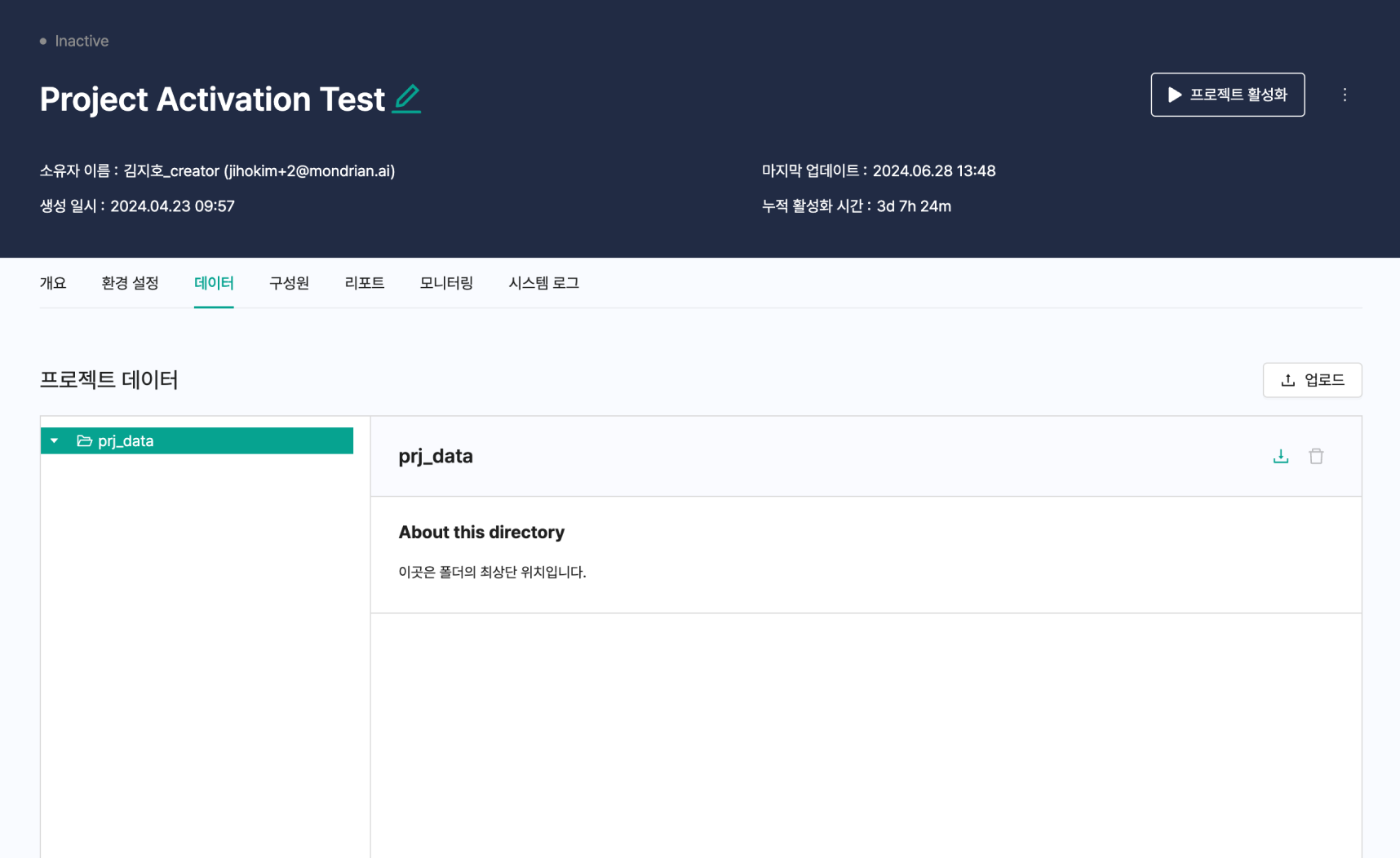 prj_data 폴더에서는 프로젝트 데이터에 업로드 된 데이터 확인하실 수 있습니다.