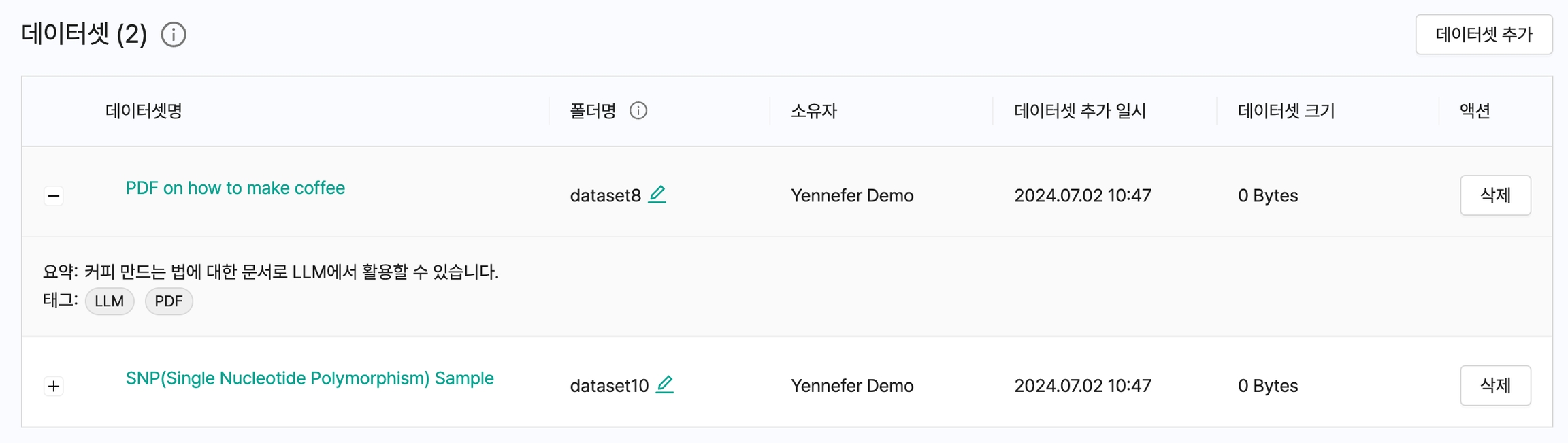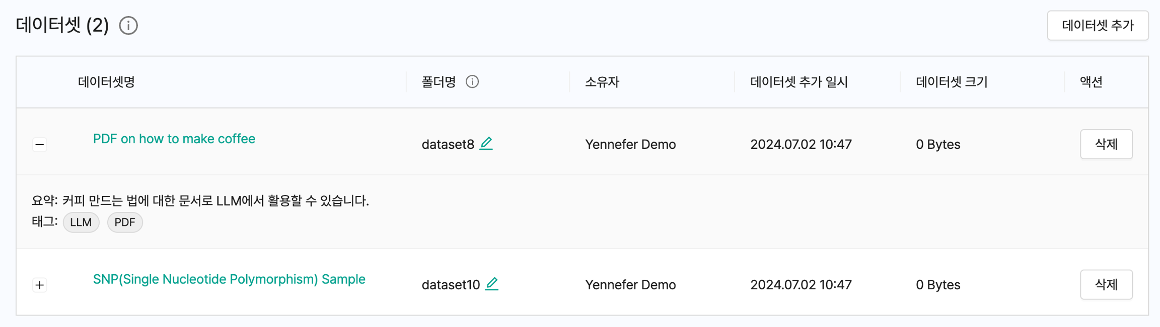 데이터셋은 Yennefer에 업로드 된 공용 데이터로 모든 사용자가 자유롭게 사용하고 공유할 수 있는 데이터입니다. 해당 프로젝트에 사용되는 데이터셋을 확인할 수 있으며 추가 및 삭제가 가능합니다.
