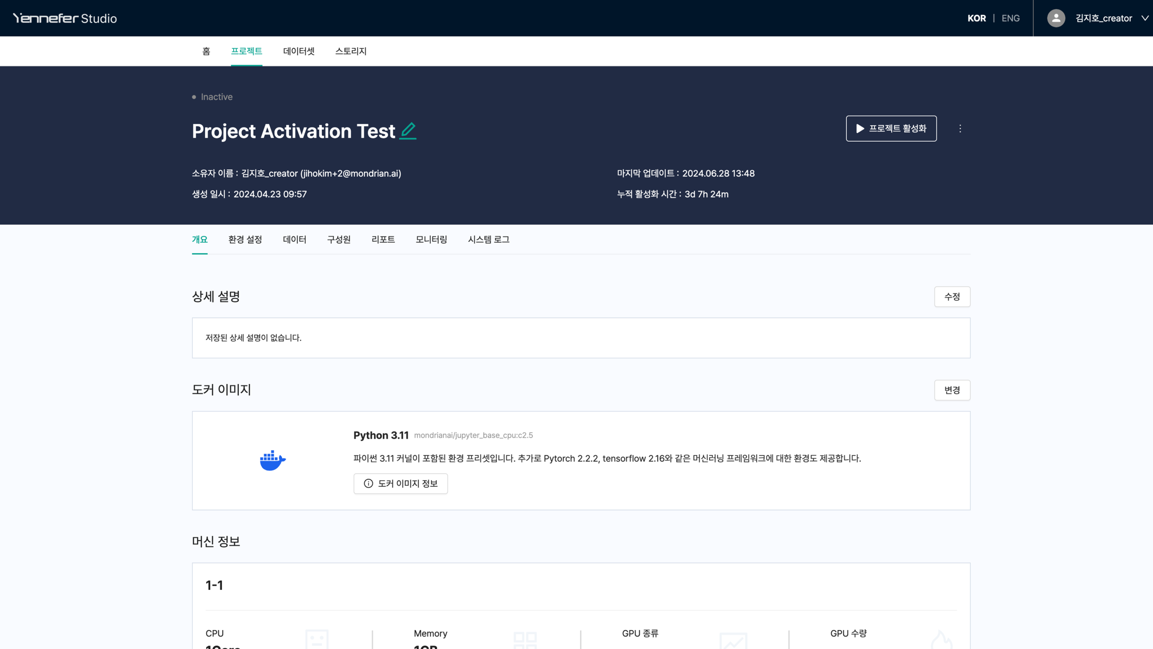 개요 : 프로젝트에 대한 상세설명, 도커 이미지, 머신 정보, 최근 추가된 데이터셋을 확인할 수 있습니다.