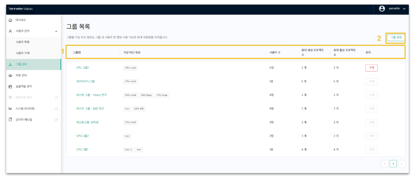 그룹 관리에서는 신규 그룹을 생성하고 그룹별 자원(머신)할당 및 프로젝트 수를 제한할 수 있습니다.