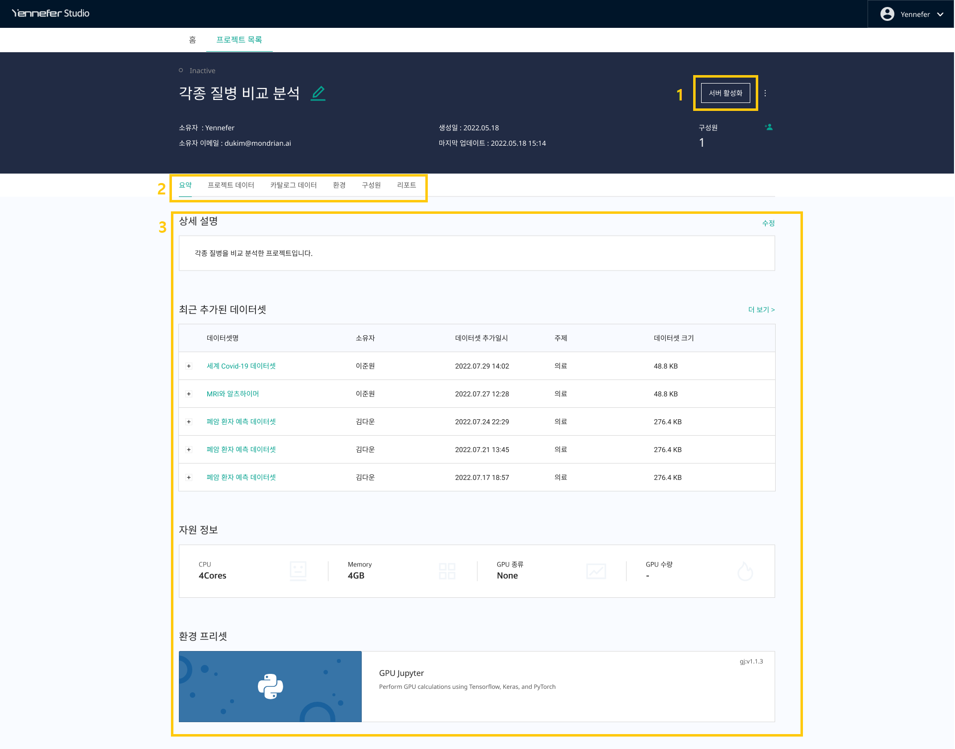 * **환경** : 프로젝트의 **자원정보 및 환경 프리셋**을 확인할 수 있습니다.