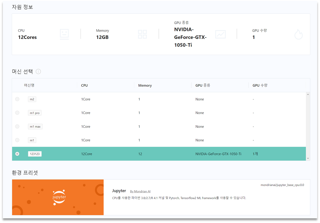 * **머신 선택 :** 프로젝트에 활용되는 자원(머신) 정보를 확인할 수 있으며, 프로젝트 비활성화 상태일 때 변경이 가능합니다.