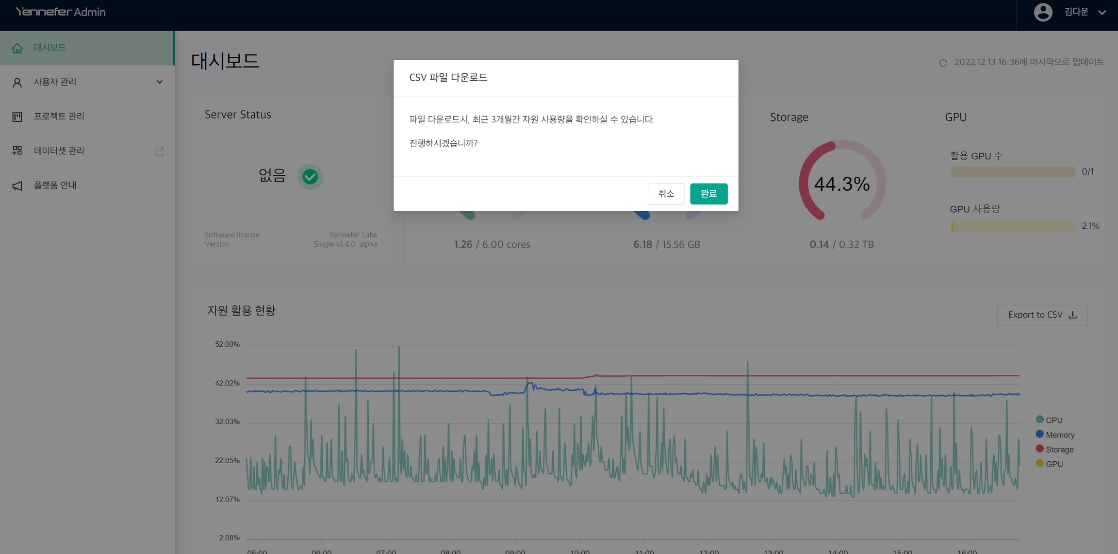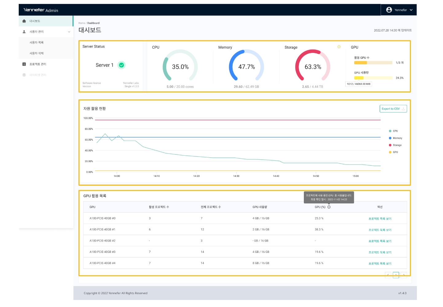 Dashboard에서는 자원 사용량에 대한 현황과 서버 정보를 확인할 수 있습니다. 이곳에서 관리자는 모든 프로젝트에 대한 현황을 체크하고 관리할 수 있습니다.