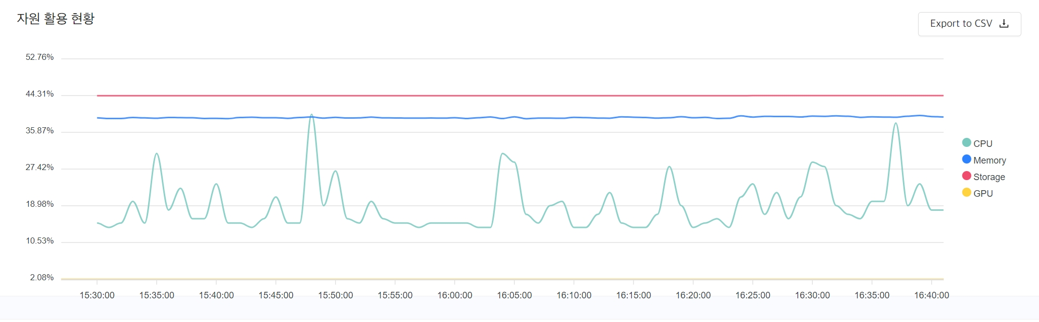 자원 활용 현황에서는 실시간으로 각 처리 장치에 대한 사용량을 확인할 수 있습니다.