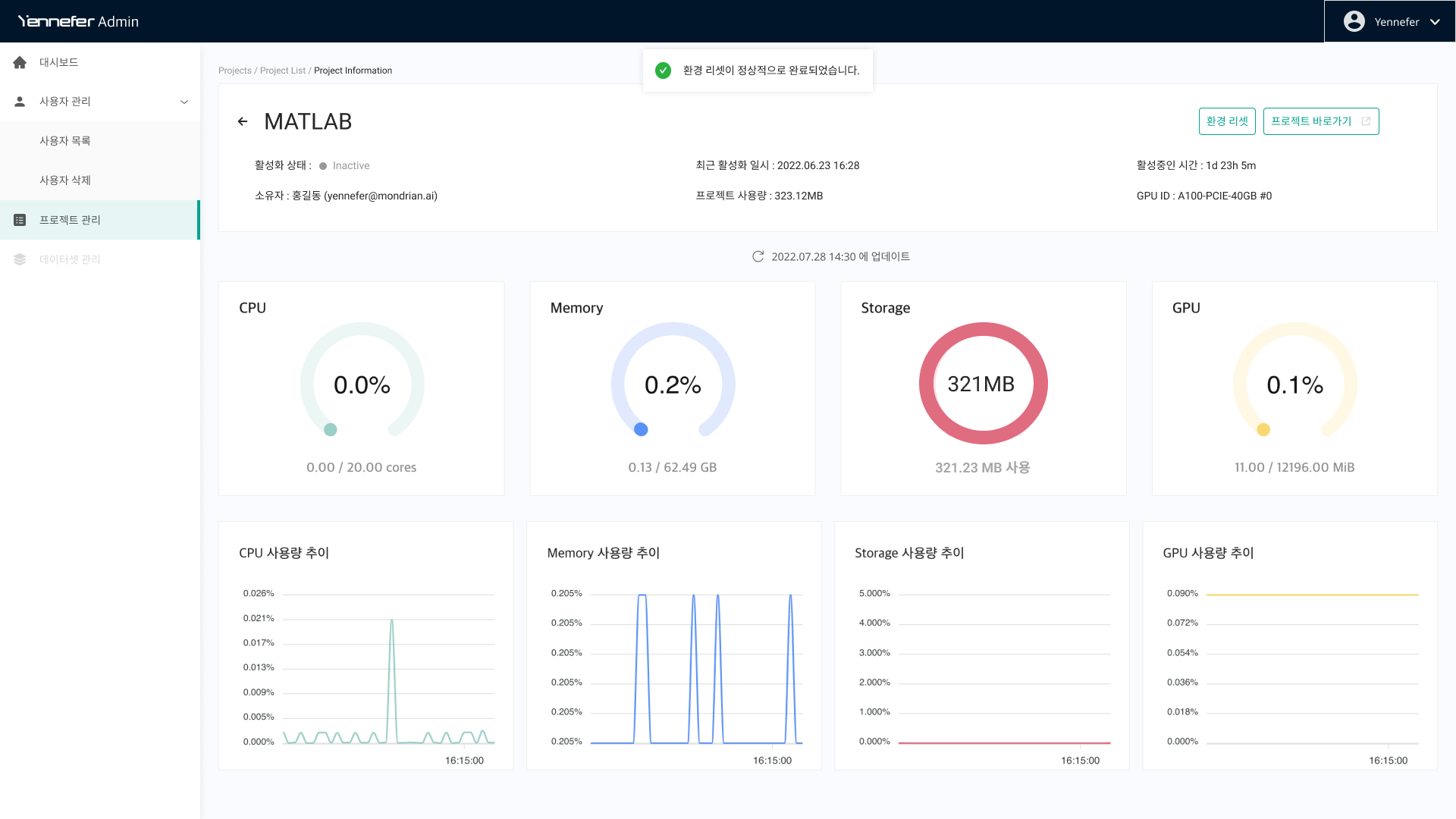 관리자가 해당 프로젝트 사용자(소유자)보다 먼저 환경 리셋을 처리한 경우, 사용자가 프로젝트 활성화 시, 정상적으로 프로젝트 실행이 가능합니다.