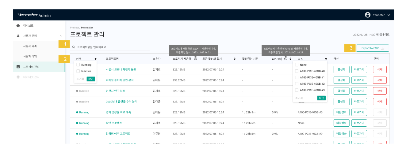 GPU : 해당 프로젝트에 할당된 GPU ID를 의미합니다. 필터를 통해 특정 GPU를 사용한 프로젝트만 출력이 가능합니다.