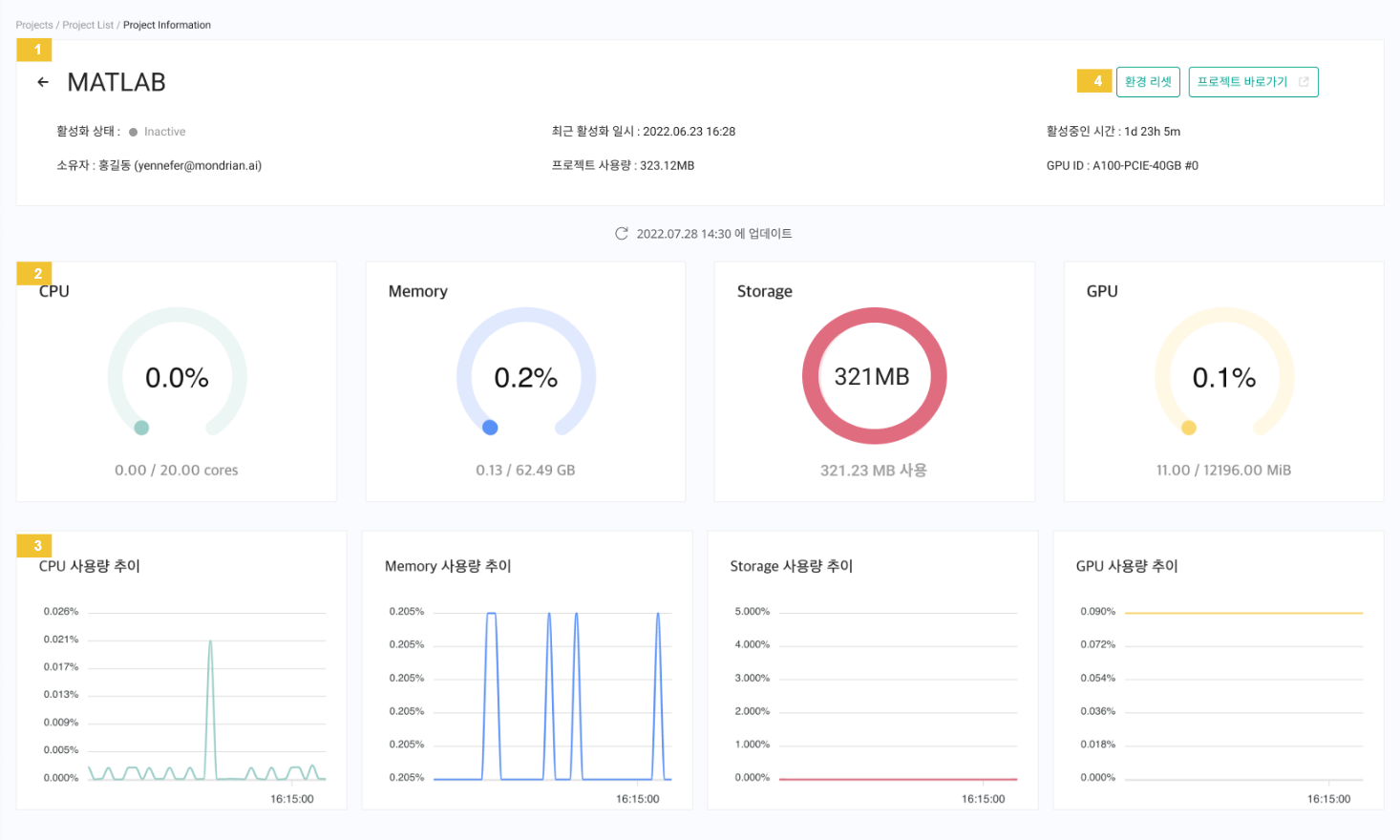 CPU, Memory, GPU 전체 대비 사용량을 출력하며 Storage의 경우, 해당 프로젝트가 사용한 값(프로젝트 및 컨테이너 데이터 값)을 출력합니다.