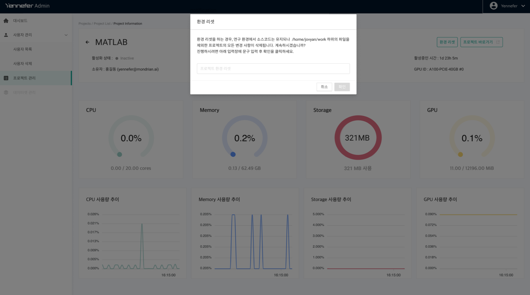사용자(소유자)의 GPU권한이 변경된 상황에서 관리자보다 먼저 서버 실행하는 경우, 사용자가 Studio 프로젝트 활성화 시 "프로젝트 환경 리셋” 모달이 출력됩니다.