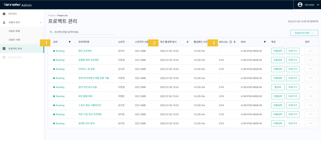 예를 들어 상태를 Running (활성화), 최근 활성화 일시는 내림차순, GPU 0번을 사용 중인 프로젝트 목록을 확인하고 싶다면, 필터 및 정렬을 통해 조건을 적용합니다.