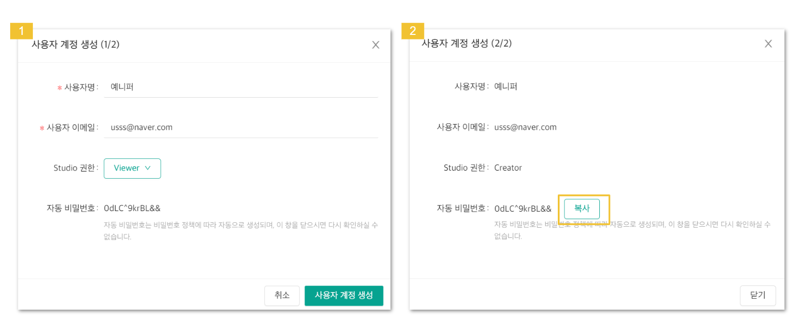 부여된 자동 비밀번호의 "복사" 버튼을 클릭하여 사용자에게 전달합니다.