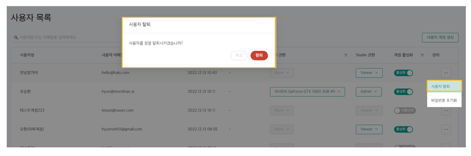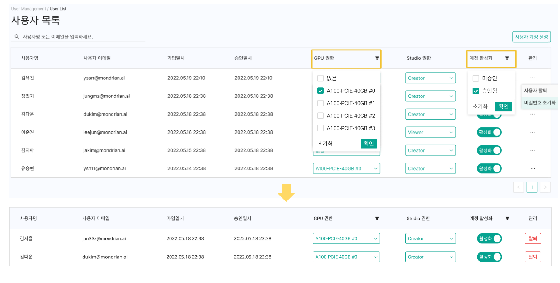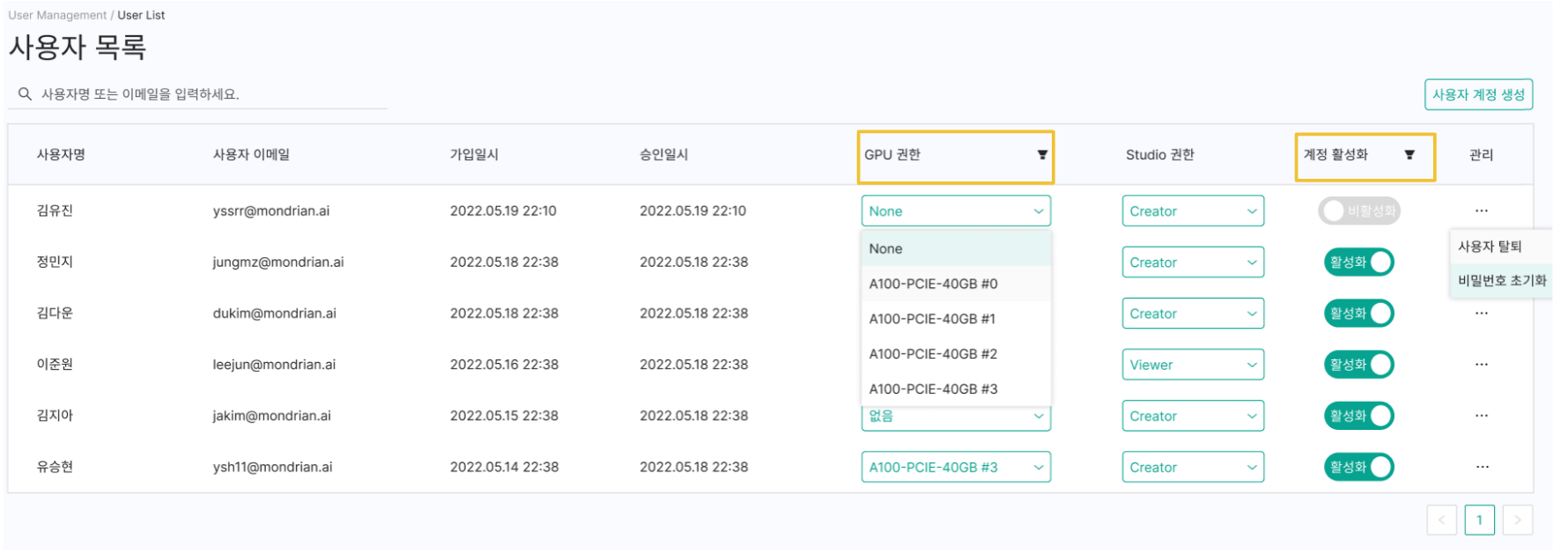 목록필터 : GPU 권한과 계정 활성화의 경우 필터링이 가능하며, 초기화 버튼을 통해 적용된 필터 조건을 초기화할 수 있습니다.