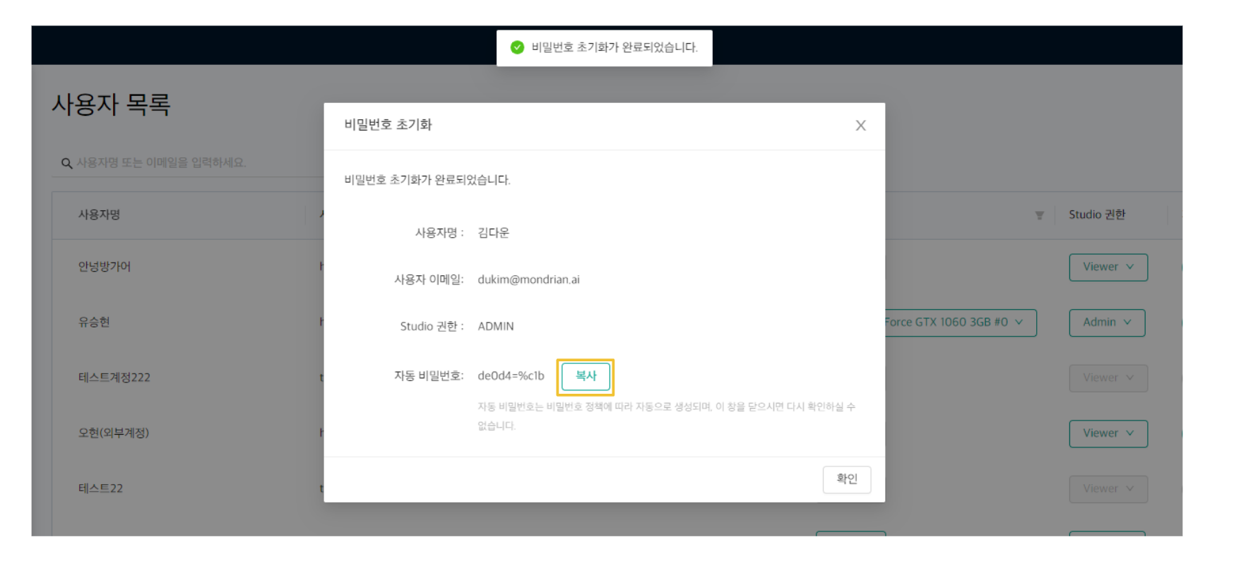 이때 완료 모달이 뜨고 자동 비밀번호가 부여됩니다. 모달창을 닫으면 자동 비밀번호 확인이 불가하니 반드시 복사하여 해당 사용자에게 전달하시기 바랍니다.