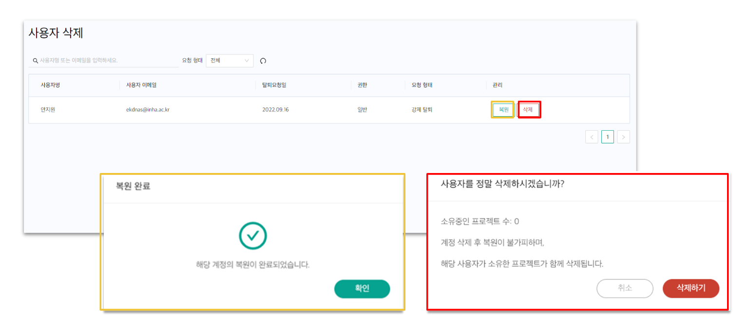 사용자 삭제 (복원 / 삭제)