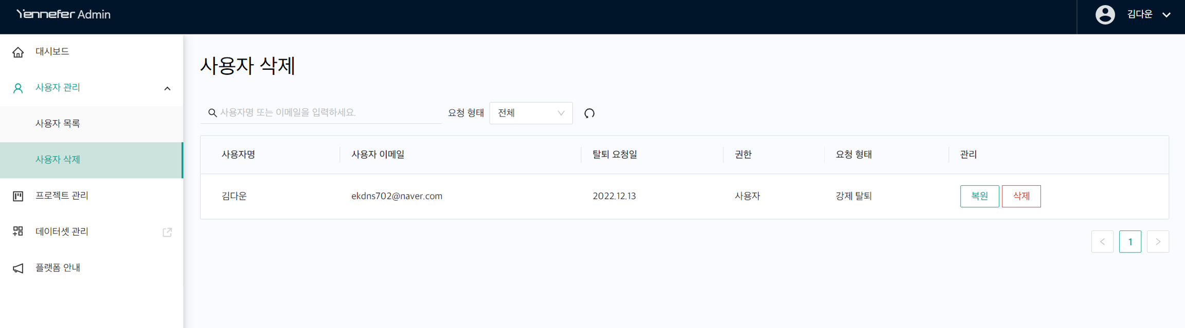 우측 사용자 관리 메뉴에서 “사용자 삭제” 클릭하시면 해당 페이지로 전환됩니다. 사용자 삭제에서는 탈퇴 처리된 사용자 목록을 확인할 수 있습니다.