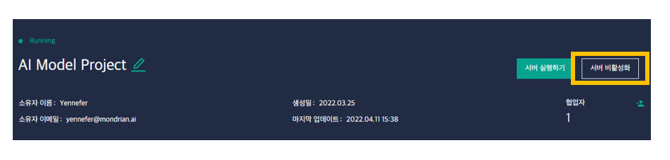 Yennefer Studio 프로젝트 상세페이지에서 "서버 활성화 > 서버실행하기"를 클릭하여 IDE를 실행합니다.